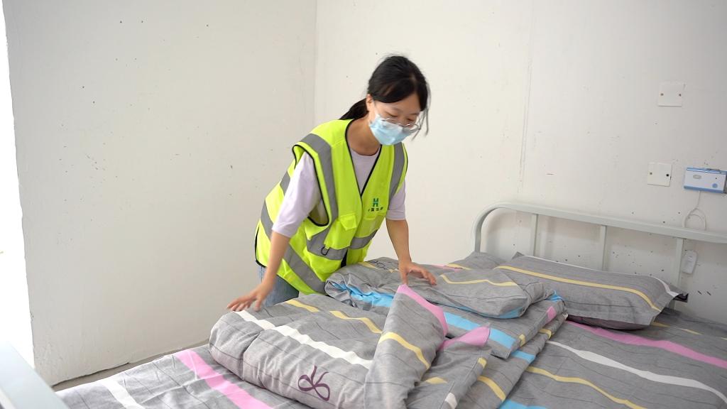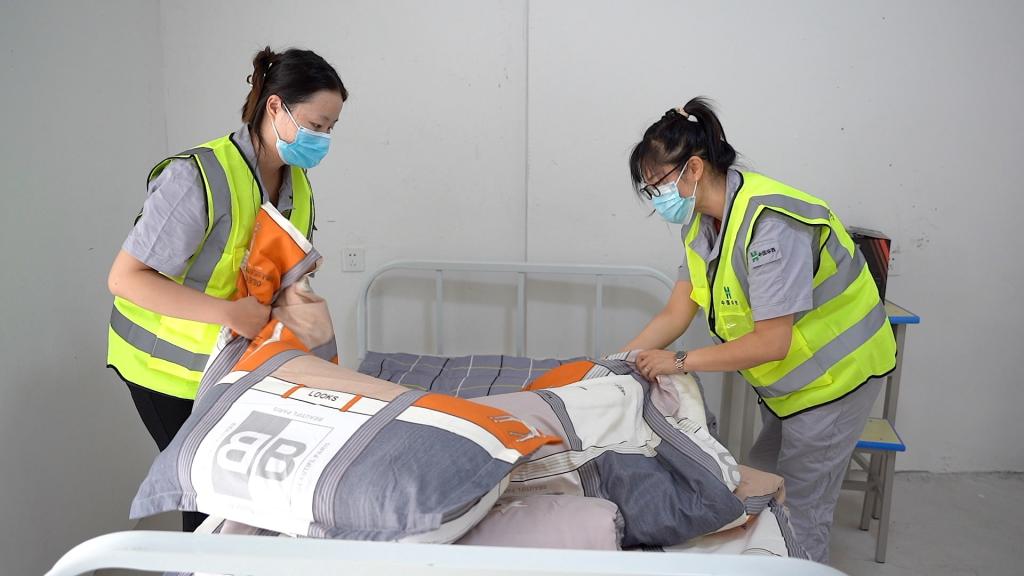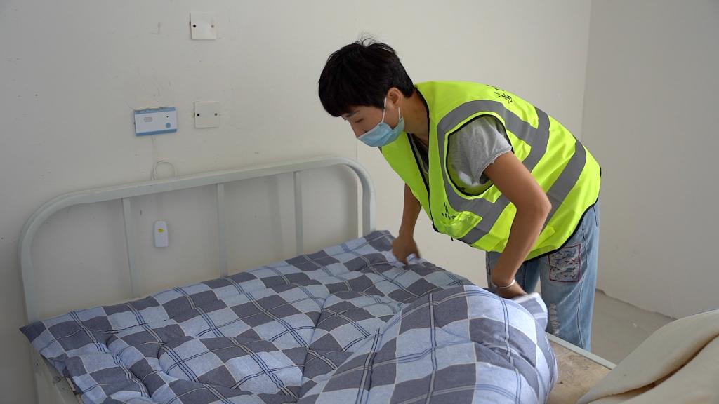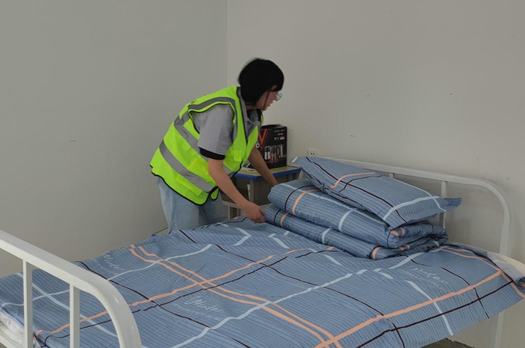 200床被褥还未铺好,细心的女职工巾帼不让须眉,她们动作敏捷、快速利落,一个下午就将一张张“裸床”铺好床单被套,棉被、枕头摆放整齐。