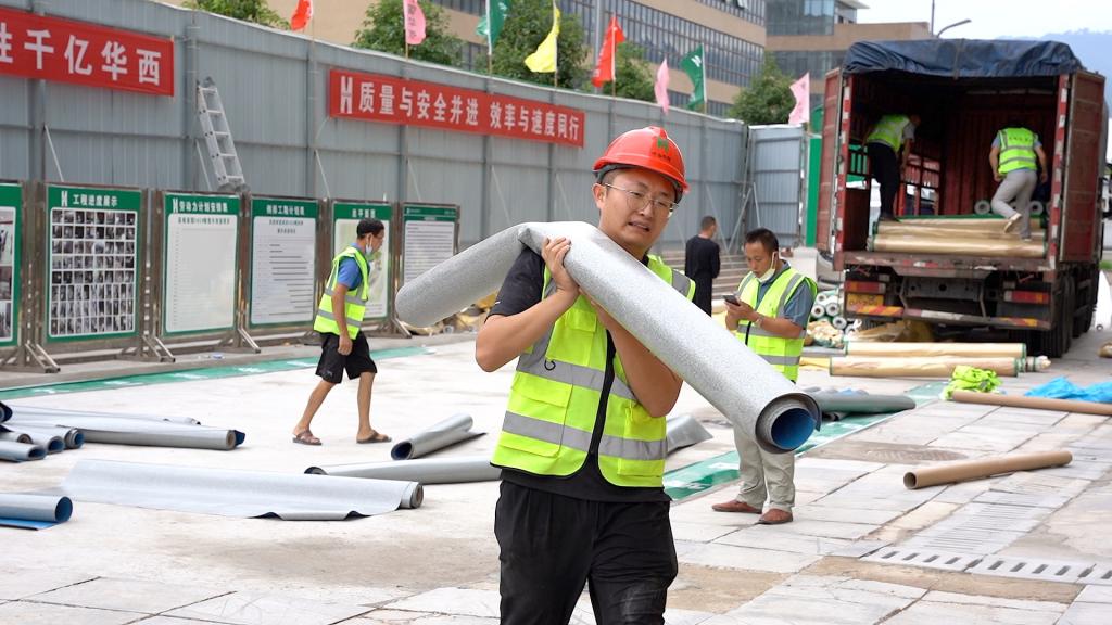 刚到货的6000平方米塑胶地板需要立即铺装,缺少搬运工,男职工们主动请缨卸货、转运,他们用肩挑背扛的方式将15吨塑胶地板运送上楼。