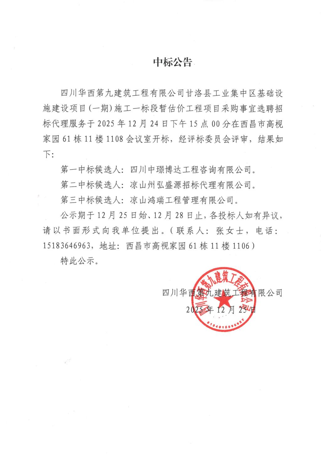 四川华西第九建筑工程有限公司甘洛县工业集中区基础设施建设项目(一期)施工一标段暂估价工程项目采购事宜选聘招标代理服务中标公告
