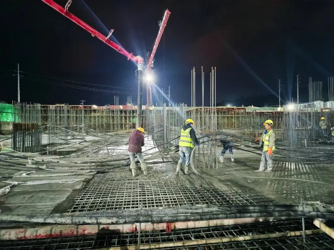 该项目施工任务繁重,自2022年12月进场开始,施工现场就进入每日“白+黑”施工模式。从刚进场,就同建设单位协调搬迁和高压线移线等难题,短短三个多月就完成了现场打围、临舍搭建、土方开挖,并于3月21日完成第一次筏板砼浇筑。