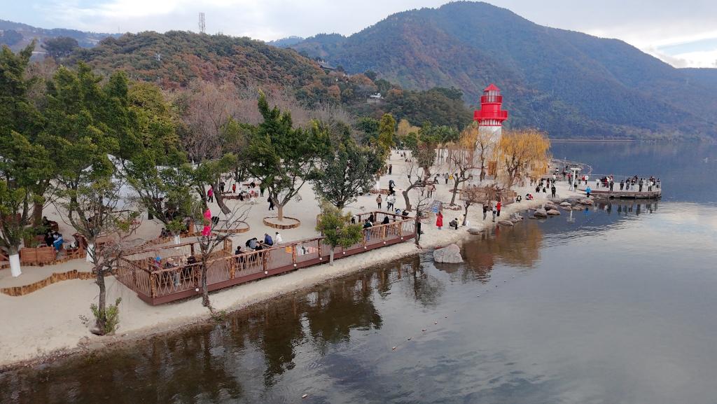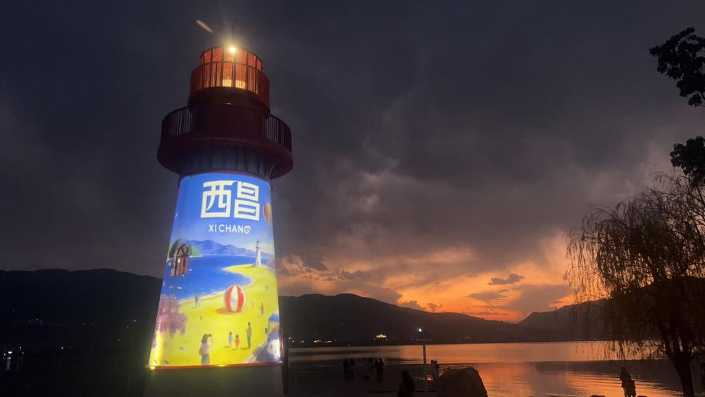 全新呈现的金鳞沙滩,在原有碧海白沙、椰影摇曳景观基础上,打造“阳光+咖啡”的慢休闲场景。钢结构灯塔则以16米高的圆锥形造型成为视觉地标,具备夜间导航与景观照明功能,夜晚亮灯后成为邛海沿岸的璀璨亮点。全景景观平台依托地形优势,视野开阔无遮挡,可观赏邛海全景与环湖湿地风貌,成为摄影打卡与休憩观景的优选空间。此外,项目同步完善了亲子游乐区、生态停车场及配套服务设施,实现自然景观与人文体验的深度融合,让游客在高原淡水湖畔尽享热带海滨风情。