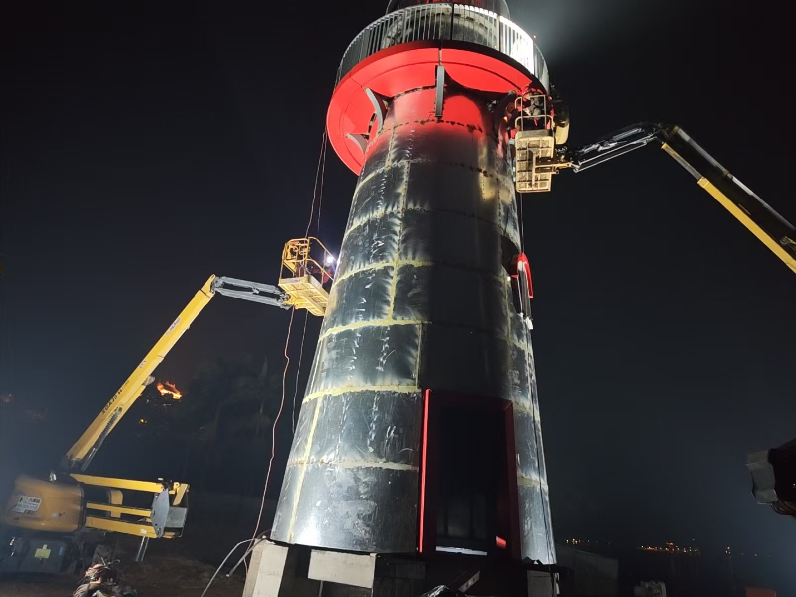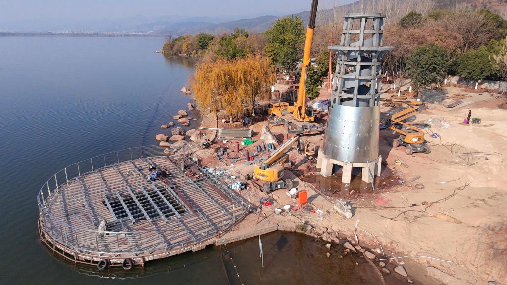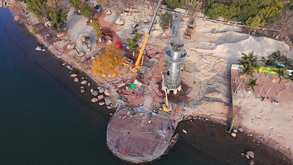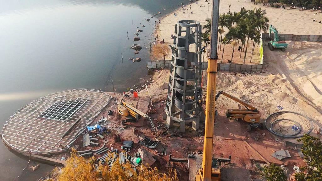 在本项目施工中,公司凭借在应急工程与文旅项目中的丰富经验,用时19天高效推进项目落地。创新采用“工厂预制+现场拼装”的精益建造模式,灯塔钢结构构件提前在工厂加工成型,现场通过精准吊装快速组装;咖啡馆采用模块化装修工艺,缩短现场施工周期;景观平台基础施工与沙层铺设同步交叉作业,最大化提升施工效率。施工过程中,项目团队严格遵循邛海生态保护要求,优化施工流程,减少环境扰动,所有建筑材料均符合绿色环保标准,确保工程质量与生态保护双达标,彰显国企匠心与社会责任。
